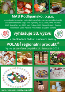 MAS Podlipansko vyhlašuje 33. výzvu k předkládání žádostí o udělení značky POLABÍ regionální produkt®. Jste šikovný výrobce, který tvoří z místních surovin? Jste zemědělec, který pěstuje s láskou a poctivostí? Jste řemeslník s jedinečným uměním v rukách?